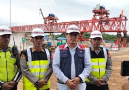 Banyuasin,- Pelaksanaan pemasangan balok jembatan Jalan Tol Trans Sumatera (JTTS) diruas Jalintimsumsel Palembang-Jambi di STA 111+250 yang terdapat di Tebing …